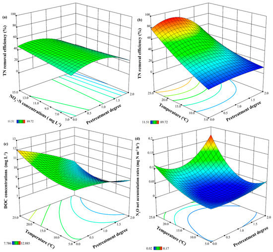 The simulated TN removal efficiency under the interactions of pretreatment degree and NO3−−N concentrations (a) and the interactions of pretreatment degree and temperature (b); the simulated DOC release under the interactions of pretreatment degree and temperature (c); the simulated N2O net accumulation rates under the interactions of pretreatment degree and temperature (d) using RSM.