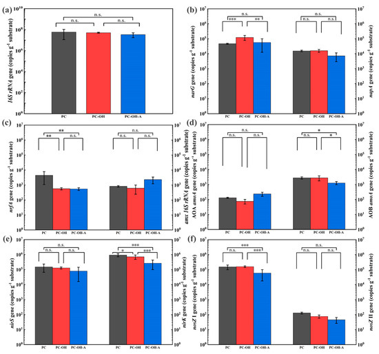 To further explore the involved nitrogen removal pathways, the absolute abundance of nitrogen functional genes was detected and is shown in Figure 4. The absolute abundance of the 16S rRNA gene in PC (5.85 × 107 copies/g) was higher than that in PC-OH (5.10 × 107 copies/g) and PC-OH-A (3.37 × 107 copies/g) with no significant difference, representing that the abundance of microorganisms in each SPD system had reached saturation. Most of the soluble small molecule organic substrates released from composite carbon sources are utilized by denitrifying microbes to supply denitrification, which is the most likely and favorite pathway [3]. The narG and napA genes encoding nitrate reductases are generally used as the markers of nitrate reduction. The abundance of narG genes was 3.07–7.86 times higher than that of napA genes, suggesting that nitrate reductases encoded by the narG gene dominated in NO3−-N reduction. Previous studies have demonstrated that the microorganisms containing the narG gene are more likely to live in anaerobic conditions, while the microorganisms harboring the napA gene prefer aerobic conditions [37,38]. Moreover, the notably higher amounts of narG genes in PC-OH (p < 0.05) indicated that the alkaline pretreatment of plant materials promoted the enrichment of denitrifying microorganisms and consequently improved denitrification performance.