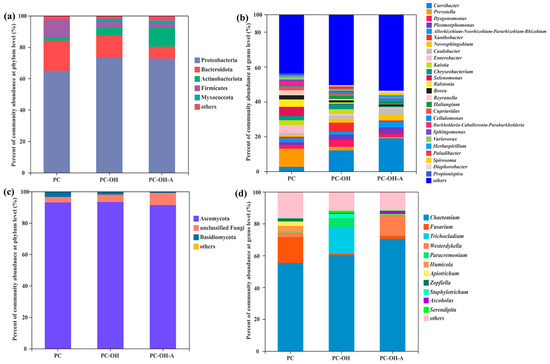 The dominant phylum was Ascomycota, with huge quantitative superiority (91.43–93.40%), followed by Basidiomycota (0.77–3.36%) (Figure 5c). Most of the denitrifying fungi that have been identified are affiliated with Ascomycota [54]. In addition, Basidiomycetes have the physiological capacity to degrade lignocellulose and xenobiotic compounds due to their oxidative enzymatic arsenal [55], which contributed to the biodegradation of lignocellulose in composite carbon sources. At the genus level (Figure 5d), Chaetomium played a leading role in biofilms, with a relative abundance of 55.36–70.32%. However, the second dominant genera were distinct and were Fusarium (16.26%), Trichocladium (16.78%), and Westerdykella (12.71%) for PC, PC-OH, and PC-OH-A, respectively. Some species of Chaetomium are known as cellulolytic fungi with the potential ability to degrade cellulosic waste [56]. Fusarium can produce diverse lignocellulose-degrading enzymes, which could be utilized for biotechnological applications [57]. Trichoderma can generate abundant lignocellulolytic enzymes and have been deemed as efficient compost microbes [58]. A previous study showed that Westerdykella exhibit the ability to degrade refractory organic compounds such as poly-ethylene terephthalate and polycyclic aromatic hydrocarbons [59]. Considering the lowest DOC level in PC-OH-A (Figure 1c), the excessive pretreatment degree of plant materials led to a large loss of organic matter and a lack of carbon sources, which eventually resulted in the enrichment of Westerdykella that could degrade refractory organic matter. In addition, most of the other classified genera (relative abundance > 1.00%) were able to degrade lignocellulose, such as Paracremonium, Humicola, Apiotrichum, Staphylotrichum, and Ascobolus (Supplementary Materials).