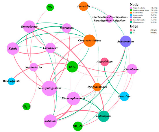 Co-occurrence network analysis is a valid method to simplify complex interactions among functional microbes, identify the keystone taxa, and infer potential relationships among microorganisms. To highlight the important and potential interactions, only strongly and statistically significant relationships were retained, which is beneficial for identifying key organisms in complex microbial communities. To explore the interactions between microbial genera and environmental factors, a co-occurrence network was constructed (Figure 6). A total of 18 genera and 4 environmental factors were involved in the network. The genus nodes belonged to four bacterial phyla (Proteobacteria, Bacteroidota, Firmicutes, and Myxococcota) and two fungal phyla (Ascomycota and Basidiomycota), and more than half of them came from Proteobacteria and Bacteroidota. Novosphingobium, which belongs to Proteobacteria, achieved distinctly higher association than other bacterial genera, demonstrating its indispensable role in bridging microbial communities and environmental factors. The same was true for Fusarium, affiliated with Ascomycota. It is noteworthy that four environmental factors (DOC, NH4+-N, NO3−-N, and TN) exhibited evidently strong correlations with microbial species. Westerdykella, Novosphingobium, and Caulobacter with the ability to degrade refractory organic compounds showed strongly negative associations with DOC, suggesting their crucial role in the degradation of refractory organics with the increased pretreatment degree. As the main identified denitrifying bacteria, Kaistia and Chryseobacterium revealed distinctly positive associations with DOC, which might be attributed to their feature of denitrification using carbon sources. Selenomonas and Prevotella were positively related to NH4+-N, which was largely due to their potential to participate in DNRA [60,61]. The strong negative association between Xanthobacter and NO3−-N or TN demonstrated the central role of this genus in NO3−-N reduction. These genera with relatively low abundance but high associations implied that it might be their roles in microbial networks or unique metabolic pathways rather than their abundance dominance that contributed to microbial denitrification and carbon source degradation [62].