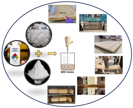 Gypsum and Portland cement are traditional mineral constituents used extensively in the manufacture of wood–mineral composites [,,]. Although these composites have a similar shape to conventional EWP, they have a wood content of less than 50% and a panel density of about 1100 kg/m3, which is far from the level required for conventional EWP. In recent years, some research groups have been working on the substitution of organic binders by mineral binders for the reasons explained above. For example, Portland cement has been used as a binder in the manufacture of plywood panels []. Berzins et al. [] have shown that geopolymers can be used for the gluing of solid wood. Researchers also successfully demonstrated that the organic binder can be replaced by a mineral binder for the laboratory production of plywood and LVL [,,]. In these works, geopolymer was formulated as a mineral binder using aluminosilicate powder and an alkaline activator prepared from a mixture of sodium silicate and potassium hydroxide. However, the use of these mineral binders in conventional EWP is associated with some technological problems in panel production, such as their high alkalinity and the silicon content of the binder [,]. To overcome these problems, Sorel or magnesium oxychloride cement (MOC) has recently gained more interest [].