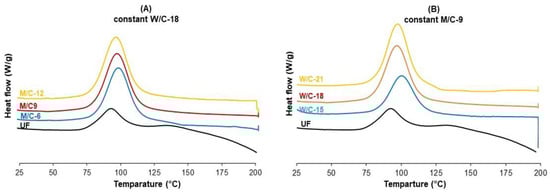 Magnesium oxychloride cement binders exhibit an exothermic reaction that contributes most to heat generation in DSC measurements (Figure 2). The addition of MgO to the binder formulation (increasing the M/C molar ratio) slightly increases the thermal heat of reaction from 342 J/g to about 375 J/g. However, increasing the W/C molar ratio from 15 to 21 increased the heat of the reaction by about 70%, rising from about 270 J/g to 461 J/g. The influence of excess water on the heat of the reaction of MOC curing could be explained by the formation of a higher magnesium hydroxide content in the system, as can also be seen later in Figure 3. Magnesium hydroxide (Mg(OH)2) is formed by the combination reaction of magnesium oxide (MgO) with ionized water, which typically takes place at a temperature well above room temperature, i.e., about 120 °C, which is possible with the hot-pressing technique []. In general, it can be said that the molar ratio of the binder components significantly affects the thermal reaction heat of the MOC binder reaction.