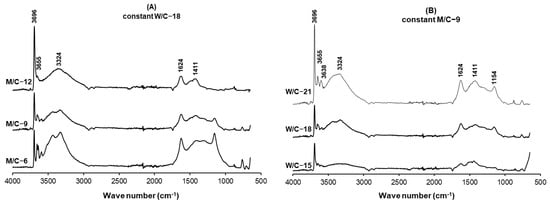 The structural changes of the different MOC binder formulations were investigated using the FTIR technique (Figure 3). The peaks at 3696 cm−1, 3655 cm−1, 3638 cm−1 and 3592 cm−1 originated from the Mg-OH bending vibrations of the phase-5 crystal []. Some of these peaks disappeared or their intensity decreased when the M/C molar ratio was increased from 6 to 12 and the W/C molar ratio was decreased from 21 to 15. Excess MgO and H2O in the binder could lead to the formation of Mg(OH)2, resulting in instability and a possible reduction in binder strength []. The bands at 3300 to 3500 cm−1 and at 1624 cm−1 can be attributed to the O-H bending vibrations and H-O-H bending moment of the crystal water, respectively []. The intensity of these peaks decreased with increasing the molar ratio of M/C and decreasing W/C, which is attributed to the reduced water in the system when these molar ratios are changed. The tiny peaks in the 1800–3000 cm−1 range caused by the symmetric and asymmetric stretching modes of the O-H bonds in H2O and Mg(OH)2 can be attributed to the further thermal stress to the cured binder in the hot press []. Moreover, the absorption bands at 1154 cm−1 are due to the weak bonding vibration of Cl-O, which disappeared in the samples with M/C-12 and W/C15 [,]. The further addition of light burnt MgO to the binder formulation (increasing the M/C molar ratio to 12) could cause the excess MgO to react more with the water molecules to form more Mg(OH)2, as shown by the sharper peak at 3696 cm-1 associated with Mg(OH)2 in the M/C-12 sample. On the other hand, the lower water content in the W/C-15 formulation could be another reason for the disappearance of the Cl-O bond in the cured binder. The peak at about 850 cm−1 is attributed to the stretching vibration of Mg-O in a cubic structure.
