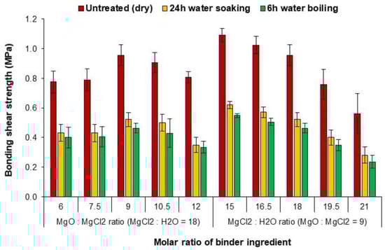 Increasing the W/C molar ratio from 15 to 21 while maintaining the M/C ratio of 9 results in a significant decrease in the shear strength of the binder. In other words, the lower the water content, the higher the bonding shear strength of the MOC binder. This was because the excess H2O reacted more with MgO, resulting in a higher content of Mg(OH)2, which reduced the strength of the binder []. Excess water could also have caused pores and contributed to the observed reduction in strength []. It is also conceivable that the binder with lower solids content (higher W/C molar ratio) penetrated more into the wood cells/cavity structure and resulted in a weak glue joint (starved glue joint) [,,]. The highest bond shear strength was observed for samples with M/C and W/C molar ratios of 9 and 15, respectively, with 1.1 MPa for the untreated sample, 0.62 MPa for the water-soaked (24 h) and 0.55 MPa for the water-boiled (6 h) samples.