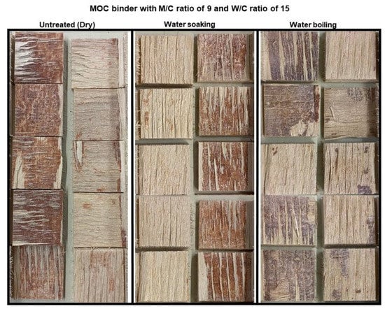The Sorel or MOC binder, which consists of magnesium oxide (MgO) in powder form (called magnesia) and magnesium chloride (MgCl2), was first described by the French scientist Stanislas Sorel in 1866 []. Compared to previously used mineral binders, MOC as a binder is preferable due to its lower pH, lower sensitivity to wood pH, lower viscosity, lighter color and silica-free ingredients [,]. A composite product with a density of 1000 kg/m3 was prepared from a mixture of wood and MOC using an extrusion process []. The MOC was also used as an inorganic adhesive for the production of flame-retardant plywood by the cold-pressing method [,]. It has been stated that the ratio of components in the MOC binder plays an important role on the characteristics of the final hydrated product []. The effects of molar ratios (MgO/MgCl2 and H2O/MgCl2) and curing conditions on MOC were investigated []. The results show that the use of appropriate molar ratios and curing conditions can significantly improve the MOC features []. Magnesium oxychloride cement products are considered to have excellent properties when the molar ratio of MgO/MgCl2 is varied between 5 and 10 [,]. In one study, the best mechanical properties of MOC products were obtained at a molar ratio of about 7 []. The curing of MOC at different temperatures between 0 °C and 65 °C was also investigated. It was shown that the curing at temperatures between 20 °C and 50 °C resulted in the most stable MOC under humid conditions []. When curing occurs at a higher temperature, a certain amount of unreacted MgO remains in the system [].