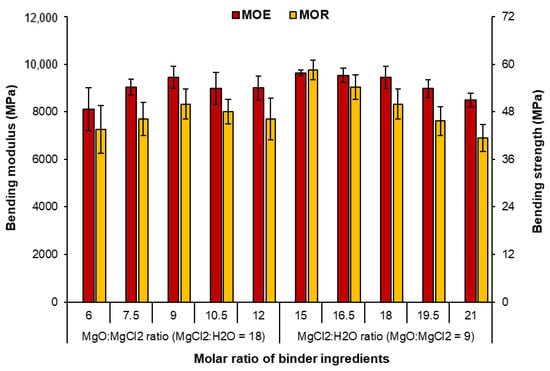 Figure 6 shows that the molar ratio of M/C and W/C in the MOC binder affects the flexural properties of the plywood specimens. Plywood made from MOC binders with M/C and W/C molar ratios of 6 and 18, respectively, had MOE and MOR of about 8100 and 44 MPa, respectively. The MOE and MOR were increased by almost 15%, while the molar ratio M/C increased to 9. This may be related to the formation of more 5-phases, as in the hardened MOC binder with increased MgO content [,]. However, both MOE and MOR decreased when the M/C ratio reached a value of 12. A similar trend was also observed when the water content in the binder system was increased (increasing the molar ratio W/C). The higher the W/C molar ratio, the lower the binder strength and the lower the bending properties of the plywood panels. A more dilute binder can penetrate more into the wood structures, resulting in a starved binder line, which in turn has a negative effect on the bending properties [,,]. Moreover, the further formation of Mg(OH)2 in the hardened binder leads to instability and a subsequent decrease in binder performance []. Excess and unconsumed water may have also caused pores and contributed to the observed reduction in strength [].