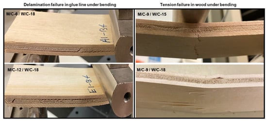 The failure modes of the flexural specimens are shown in Figure 7. The analysis of the failure modes can help to determine the relative impacts of the binder molar ratios on the bending properties of the plywood specimens. Shear failure in the binder line was the most frequently observed failure mode in flexural specimens. In other words, the binder line was delaminated and extended longitudinally along the entire length of the specimen []. This certainly influenced the flexural strength of the plywood specimens. In most plywood samples manufactured by MOC binders with a molar ratio of M/C of 9 and a molar ratio of W/C of 15 to 18, flexural failure (tensile failure in the wood) was induced in the wood layers, indicating improved adhesion in the binder line between the binder and the wood components. It is noteworthy that the flexural properties for these specimens were also the highest, which is consistent with the results of the shear strength test.