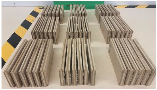 The binder was applied to the veneer surfaces with a roller, as shown in Figure 1. The application rate of the dry MOC binder was kept constant at 420 g/m2 for all plywood panels, while the solid content of the binder varied in the different formulations. The mineral binder has higher density compared to conventional adhesive; hence, a higher amount of binder is needed to meet the full coverage of veneer faces []. The average density of the plywood panels made with MOC binder was about 560 kg/m3. Three plywood panels were made for each of the variables, resulting in a total of twenty-seven panels. The manufactured plywood panels were conditioned at a relative humidity of 65 ± 3% and a temperature of 20 ± 2 °C for two weeks prior to testing.