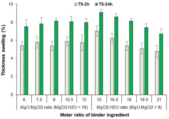 Figure 9 shows that increasing the molar ratio of M/C from 6 to 9 increases the TS, while further increasing M/C to 12 has no significant effect on TS values after both 2 and 24 h of water immersion. However, TS was significantly reduced by increasing the molar ratio of W/C from 15 to 21. Thickness swelling in wood and EWP is a complex property influenced by several factors such as wood species, density, adhesive formulation, the stress relaxation of the board and other manufacturing parameters and their interaction []. In this context, the accessibility of water molecules to the OH groups of the wood has the greatest influence on the final TS value of the EWP []. The accessibility of OH groups in the wood can be reduced by more penetration of the binder into the wood structure [,]. The solid content of the MOC binder is increased by increasing the M/C molar ratio and decreased by increasing the W/C molar ratio (Table 3). In other words, the lower the binder solid content, the higher the penetration of the binder into the wood cells and the lower the accessibility of the water molecules to the OH groups, so that the TS is reduced. In other words, a lower solids content of the binder leads to greater penetration of the binder into the wood structures and thus to less accessibility of the wood OH for water and to a reduction in the TS of the board. It is noteworthy that the TS after 24 h in all binder formulations is in the acceptable range and quite low, below 9%.