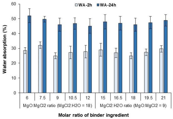 Figure 10 shows that the WA value did not change significantly at different molar ratios of M/C and W/C in the MOC binder formulation. For all binder formulations, the WA after 2 and 24 h of immersion in water was about 27% and 47%, respectively, which is similar to the conventional plywood panels bonded with urea-formaldehyde adhesive []. Apparently, all MOC binders had a dense microstructure at least during the 24 h water immersion and thus exhibited uniform moisture resistance. As also confirmed by the shear strength and delamination tests, the hot-pressed plywood with MOC as binder showed sufficient resistance to tap, and even hot water, where none of these specimens were delaminated. The curing of MOC at higher temperatures (e.g., 65 °C) resulted in a significant decrease in the moisture resistance of MOC, mainly due to the increased formation of 9-phases in MOC []. The 9-phases were found to be more susceptible to dissolution than the 5-phases, which formed predominantly at lower curing temperatures. It can be concluded that the duration of MOC hardening at elevated temperatures during hot pressing appears to have no or little impact on the moisture resistance of mineral-bonded plywood. Since hot pressing is the most expensive part of the entire production and is usually defined as a bottleneck, this finding is crucial for further progress in mineral-bonded plywood, especially with MOC as a binder.