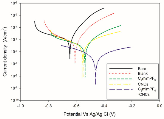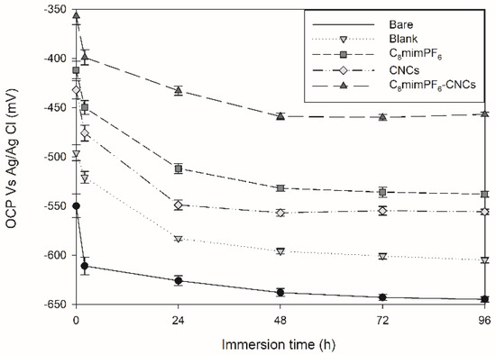 The electrochemical technique started with open circuit potential (OCP) measurement. OCP indicates the thermodynamic tendency of a material under electrochemical oxidation in a corrosive medium [15]. In other words, OCP values can reflect the extent of corrosion. Severe corrosion exhibits a more negative OCP. The variation in OCP versus immersion time in the absence and presence of C8mimPF6 and CNCs is displayed in Figure 1. At the initial immersion stage, the OCP of bare (no coating layer), blank (with a neat PMMA-co-PBA coating), C8mimPF6 (PMMA-co-PBA coating with 10 wt% C8mimPF6), CNCs (PMMA-co-PBA coating with 0.5 wt% CNCs), and C8mimPF6−CNCs (PMMA-co-PBA coating with 10 wt% C8mimPF6 and 0.5 wt% CNCs) samples were approximately −550, −496, −412, −432, and −357 mV, respectively. The drop in OCP in the first 2 h was ascribed to the penetration of corrosive ions such as OH− and Cl− and oxygen through coating micropores and the coating/steel interface [16]. After 96 h of immersion, the OCP of bare mild steel reduced sharply from −550 mV to −645 mV, which indicated that bare mild steel was severely corroded. In addition, the OCP of blank, C8mimPF6, CNCs, and C8mimPF6-CNCs samples at 96 h were −605, −538, −556, and −457 mV, respectively. The steady OCP values of these samples from 48 h to 96 h was attributed to the saturated water absorption of the coating and the accumulation of corrosion products [17]. Among them, the lowest rate of declination was observed in the C8mimPF6-CNCs sample. Thus, it could be concluded that the C8mimPF6-CNCs sample exhibited the most pronounced anti-corrosive effect.