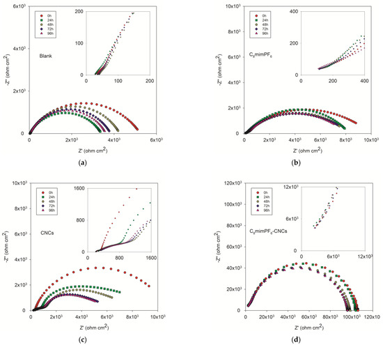 Nyquist impedance plots of coated samples after 96 h of immersion in 3.5 wt% NaCl solution. (a) Blank (neat PMMA-co-PBA coating), (b) C8mimPF6 (PMMA-co-PBA coating with 10 wt% C8mimPF6), (c) CNCs (PMMA-co-PBA coating with 0.5 wt% CNCs), and (d) C8mimPF6-CNCs (PMMA-co-PBA coating with 10 wt% C8mimPF6 and 0.5 wt% CNCs).