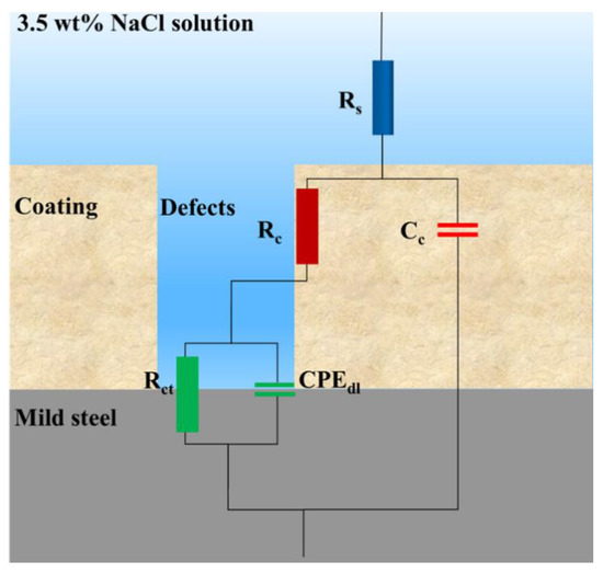 Figure 2 shows the Nyquist impedance plots of different coated samples after 96 h of immersion in 3.5 wt% NaCl solution. The Nyquist plot is one of the manifestations of EIS tests, with different parts representing different hierarchies of the coating. For instance, in Figure 2a, the bottom left part at high frequency was correlated to defects and pinholes of the coating, while the upper right part at low frequency was assigned to the interface of the coating and the mild steel surface [19,20]. The shrinking semicircles during the immersion test exhibit the declining anti-corrosion performance. The initial linear portion of the curve shown in Figure 2c could be attributed to the pseudo-two-time constant phenomenon caused by the penetration of electrolytes through the coating defects [21,22]. Moreover, an electrical equivalent circuit was applied to model Nyquist plots for quantitative evaluation. As shown in Figure 3, the circuits consisted of different electrochemical parameters such as solution resistance (RS), coating resistance (RC), coating capacitance (CC), charge transfer resistance (Rct), and constant phase element (CPEdl), where CPEdl represents the non-ideal capacitance of double layer. Here, CPE is a valid model to simulate the dielectric response, which symbolizes a real-life capacitive impedance independent of frequency [23]. Using ZSimpWin 3.60 software, the results of resistance and capacitance were fitted and presented in Figure 4. Figure 4a and c show the coating resistance (RC) and charge transfer resistance (Rct), respectively.