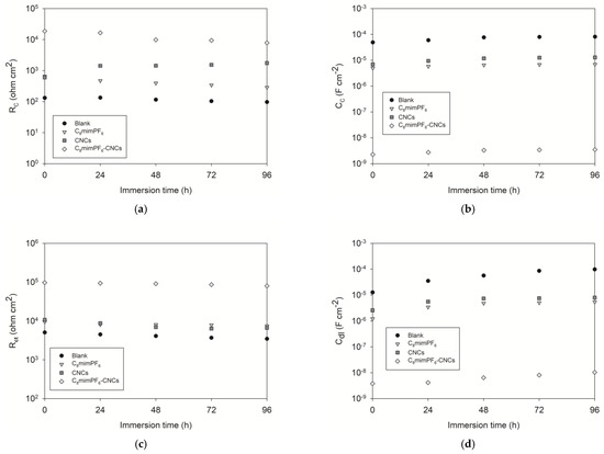 RC indicates the barrier performance to ionic paths through the coating [24]. Generally, RC values decreased with immersion time, which reveals a degradation of the coating and a decline in anti-corrosion performance [25]. As Figure 4 shows, the RC value of the blank sample decreased from 132 Ω cm2 at the initial stage to 97 Ω cm2 after 96 h of immersion. Meanwhile, the RC of the C8mimPF6 sample reduced from 624 Ω cm2 to 142 Ω cm2. The reduction in coating resistance shows the degradation of the coating. The final RC for the C8mimPF6 sample was still higher than the blank sample, which indicates the prior anti-corrosion performance of the C8mimPF6 sample compared with the blank one. In contrast to the C8mimPF6 sample, the RC of the CNCs sample increased significantly from 603 Ω cm2 at the initial stage to 1754 Ω cm2 after 96 h immersion. One explanation for this is the enhancement of the barrier effect after introducing CNCs into the coating [10]. Another possible reason may be a pseudo-two-time constant phenomenon after the penetration of electrolytes [21,22], which interferes with the curve fitting, resulting in a larger RC value than the real value. During the immersion process, the RC of the C8mimPF6-CNCs sample had the highest values of 18,670 and 7865 Ω cm2 at the initial stage and after 96 h of immersion, respectively. This value was almost 100 times higher than the RC of the blank sample, indicating the remarkable protective capability against corrosion with the combination of C8mimPF6 and CNCs. In addition, the charge transfer resistance, Rct, the resistance to charge transfer on mild steel, was inversely related to the corrosion rate [26]. Similar to the results of RC, the blank sample presented the lowest Rct at 3490 Ω cm2 after 96 h of immersion. The Rcts of the C8mimPF6 and CNCs samples were 7518 and 6677 Ω cm2, respectively, after 96 h of immersion, which was much higher than the Rct of the blank sample, indicating an enhancement in charge transfer resistance with effect of adding these two components. Surprisingly, the C8mimPF6-CNCs sample exhibited the highest Rct of 79,460 Ω cm2 after 96 h of immersion, which was nearly 22 times larger than the Rct of the blank sample and one magnitude larger than that of the C8mimPF6 or CNCs samples. After immersion tests, Lewis et al. [27] studied the corrosion resistance of a 60 µm-thick waterborne acrylic coating modified with nano-sized titanium dioxide and found that the highest resistance after 48 h of immersion in 3% (m/v) NaCl solution was approximately 18,000 Ω cm2. Our C8mimPF6-CNCs sample with a lower thickness and higher resistance is clearly more competitive, demonstrating that the lowest corrosion rate could be achieved under the synergistic effects of C8mimPF6 and CNCs.