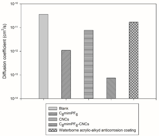 From Figure 6, after the introduction of C8mimPF6 and CNCs, the diffusion coefficient of each sample reduced from to and cm2·s−1, respectively. The C8mimPF6-CNCs sample presented the lowest diffusion coefficient of cm2·s−1, where CNCs enhanced the barrier effect of the PMMA-co-PBA coating film and C8mimPF6 inhibited the corrosion of the mild steel surface [1,9,10]. In comparison, Ji et al. [30] used the same formula to calculate the diffusion coefficient of corrosive ions in a waterborne acrylic-alkyd anti-corrosion coating and reported that the lowest diffusion coefficient was cm2·s−1 at 25% alkyd, which is higher than the D of the C8mimPF6 and CNCs samples and much higher than the D of the C8mimPF6-CNCs sample. This result further confirms the synergistic effect of C8mimPF6 and CNCs on anti-corrosion performance enhancement.