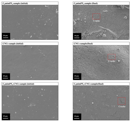 The optimal anti-corrosion performance of the C8mimPF6-CNCs was further investigated using SEM. The surface morphology with a 500 times magnification for samples before and after immersion was observed and is displayed in Figure 8. Before the immersion test, all coated samples presented a smooth surface with a few residues of copolymer particles on the surface. After the immersion test, rust covered the surface of bare mild steel, which indicated its poor anti-corrosion performance. With the coating of neat PMMA-co-PBA, the surface exhibited some defects instead of the rust observed in the blank sample, which was a sign of anti-corrosion enhancement. After incorporating C8mimPF6 or CNCs, defects were replaced with a small number of cracks, indicating a further improvement in anti-corrosion properties. With the synergistic effect of C8mimPF6 and CNCs, the C8mimPF6-CNCs sample exhibited optimal anti-corrosion performance with sparse cracks and a smooth surface.