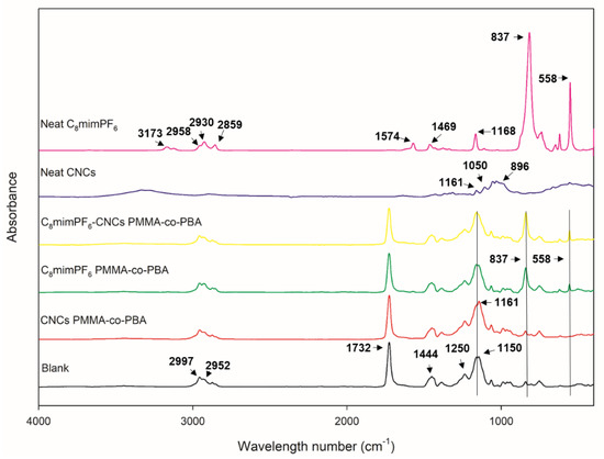 To identify the status of C8mimPF6 and CNCs in the PMMA-co-PBA coating, the FTIR spectra of the as-received C8mimPF6 and CNCs and the as-prepared samples were measured and plotted in Figure 9. For C8mimPF6, characteristic peaks of C8mim+ were present at 3173 cm−1 (aromatic n(C–H) stretching vibration), 1574 cm−1 (imidazolium H–C–C bending), 1469 cm−1 (imidazolium H–C–N bending), and 1168 cm−1 (imidazolium C2–N1–C5 bending), and the peaks at 837 (P-F stretching vibration) and 558 cm−1 (P-F bending vibration) were assigned to PF6− [37,38,39]. Meanwhile, the distinct characteristic peaks of CNCs were 1161 cm−1 (C-O-C vibration in pyranose ring), 1060 cm−1 (C–O–C asymmetric stretching vibration), and 896 cm−1 (β-glycosidic linkages of glucose ring) [40,41,42,43]. For neat PMMA-co-PBA, peaks at 2997, 2952, and 1444 cm−1 represented the –CH3 stretching vibration, the –CH2– stretching vibration, and the C–H bending vibration, respectively [44]. In addition, the carboxyl group’s C–O–C stretching vibration induced peaks at 1732, 1250, and 1150 cm−1 [44,45]. In the C8mimPF6 copolymer sample, peaks at 837 cm−1 and 558 cm−1 were observed, which proved the existence of C8mimPF6. Moreover, the peak at 1060 cm−1 demonstrated the existence of cellulose C–O–C functional groups in the CNCs copolymer sample; the peak might be overlapped by the peak of the carboxyl stretching vibration in the copolymer at 1150 cm−1. In the C8mimPF6-CNCs copolymer sample, these peaks mentioned above were all observed, and confirmed the co-existence of C8mimPF6 and CNCs. As for the interaction between C8mimPF6 and CNCs, it has been reported that cellulose can be dissolved in some kinds of ionic liquids [46]. However, the solubility of lignocellulose in imidazolium ionic liquid with PF6− anions was extremely low (0.1%) [47]. Therefore, CNCs were not dissolved in C8mimPF6. Moreover, C8mimPF6 and CNCs do not contain vinyl or styrene groups. No other new peaks aside from the C8mimPF6 and CNCs peaks were observed in the spectrum. Thus, it can be concluded that C8mimPF6 and CNCs did not attend the reaction. Due to the stabilizing properties of CNCs reported in the previous literature [48], CNCs might form strong physical interactions with PMMA-co-PBA. It is speculated that C8mimPF6 was encapsulated in a PMMA-co-PBA droplet, and CNCs behaved as a co-stabilizer adsorbed on the droplet surface.