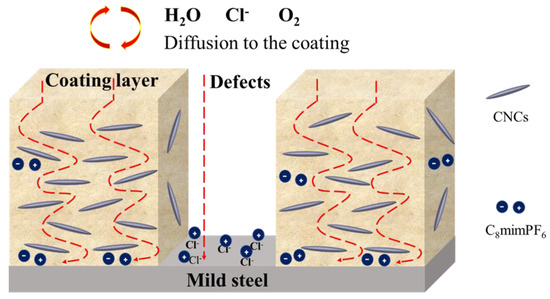 With all the results listed above, the synergistic anti-corrosion mechanism of C8mimPF6 and CNCs could be summarized. As shown in Figure 11, at the initial stage of immersion, oxygen, moisture, and other corrosive ions such as Cl− diffuse through the micropores and defects of the copolymer coating to the coating interface and mild steel. Without C8mimPF6 and CNCs, oxidation and reduction occurred at the interface listed below [52].