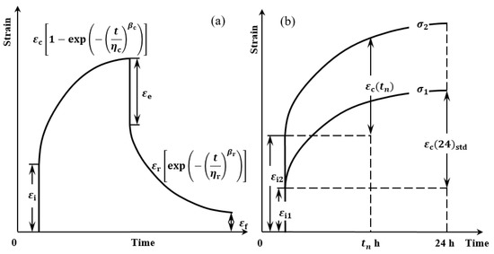 Here, εi is the instantaneous strain from applied stress which is time-independent; εc function is the time-dependent creep strain, where ηc is the characteristic life, and βc is the shape parameter. Following the removal of the creep stress, the elastic deformation is recovered, as represented by εe in Figure 1a, and the remaining recovery strain εrvis(t) is:
