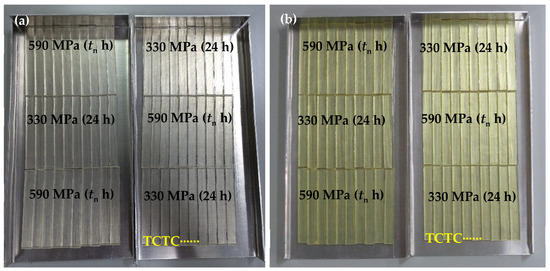 A calibrated fan-assisted oven was used for accelerated aging, with long-term temperature stability of ±0.5 °C. Batches of samples with fibres previously subjected to creep at 590 MPa for tn h were aged, together with the standard VPPMC sample batches for comparison. Owning to the limitation in capacity of the fan-assisted oven, three batches of VPPMC samples fabricated with each of the two creep conditions were evaluated (i.e., six batches in total). Heat treatment was maintained at a constant 70 °C for 2298 h (3.2 months), which is equivalent to an exposure of 20,000 years at 20 °C in terms of viscoelastic recovery within the nylon fibres following the TTSP in Section 2.2. Samples were placed as a single layer on the tray, and Figure 2a shows the arrangements of samples before aging, with individual test and control samples in alternating positions. This ensured all the batches were subjected to the same heat conditions. Figure 2b shows the samples after accelerated aging. Samples were removed from the trays and stored in polythene bags at room temperature for a further 336 h prior to impact tests.