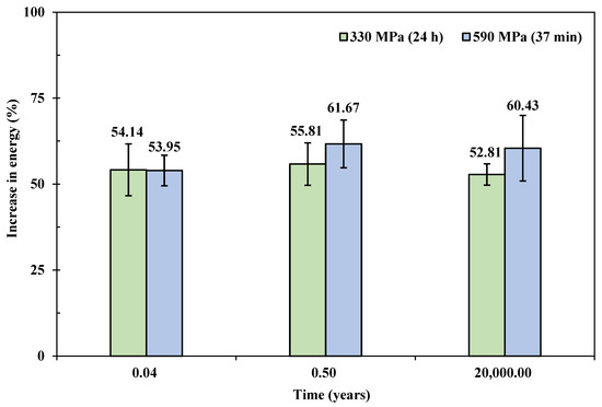 The durability of VFP within the composite is plotted in Figure 5 in terms of Charpy impact resistance. It is clear that the 590 MPa, 37 min creep-conditioned VPPMC samples show a comparable increase in absorbed impact energy with the standard 24 h creep condition (330 MPa) in terms of both natural aging and accelerated aging. This demonstrates that the same pre-strain level achieved through higher creep stress via a shorter term remains active, and there is no deterioration in increased energy absorption in either naturally aged samples up to 0.5 years or accelerated aged to an equivalent of 20,000 years at room temperature. For a VPPMC produced with a viscoelastic creep strain level of ~3.4%, the prestress effects can be expected not to deteriorate for at least ~25 years at a constant 50 °C. This would lead VPPMCs to many practical industrial applications.