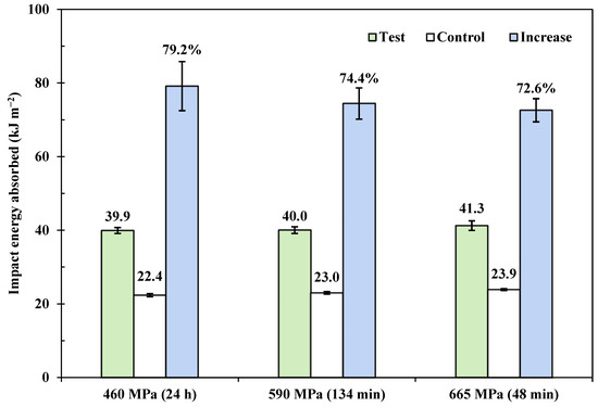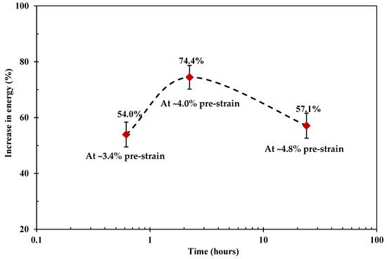 The resulting mean data from Table 5 are shown in Figure 6 for comparison. Again, the optimised conditions are in good agreement with the 24 h creep runs in terms of an increase in impact energy absorption. Although there is a slight decrease in increased impact energy over the three creep conditions, from 79% to 73%, little difference was observed in impact energy absorption (in absolute terms). In fact, two-tailed hypothesis testing results show that there is no significant difference in absorbed energy increase, i.e., they are similar. Compared to the creep strain level at ~3.4%, raising the viscoelastic creep strain level to ~4.0% gives a mean increase in energy absorption of ~75%. Thus, an 18% increase in pre-strain level results in a further increase of ~34% in prestress benefits.