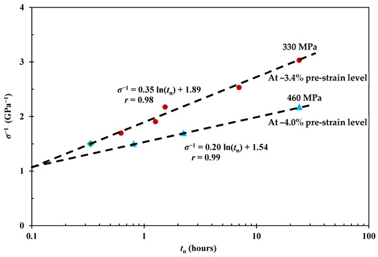 Figure 7 shows the relationship between applied stress σ and tn at a pre-strain level of ~4.0% following the principle described in Figure 1, together with the curve at ~3.4% pre-strain level from Figure 3, and fitted by Equation (3). It shows that the two curve fits meet at ~0.1 h with a creep stress of ~920 MPa, which infers that the fibre breaks after a very short time loading. Since the breaking strength of nylon fibre is up to 900 MPa, again, Equation (3) indicates reasonable predictions on prestress equivalence.