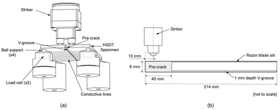 For the HSDT tests, rectangular plates of 108 × 214 × 6 mm3 with a 1 mm depth 90 °V axial groove for guiding the crack path (Figure 1b) were molded in a Battenfeld HM 100/525 injection molding machine at an injection temperature of 190–220 °C, an injection pressure of 60 MPa, and a packing pressure of 50 MPa. The mold was kept at room temperature. A 40 mm pre-crack was introduced at one end of the plate (at the end opposite to the injection gate), while an axial razor blade slit was scored on the opposite surface of the V groove to inhibit ligament tearing [].