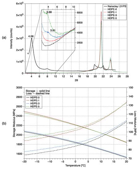 (a) The WAXD pattern and (b) storage and loss moduli for different HDPE–clay nanocomposites (containing 0, 1, 3, and 5 wt% of nanoclay, respectively).