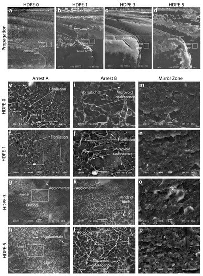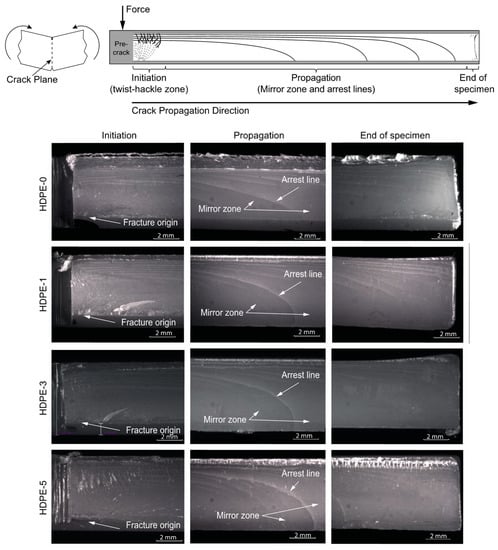 Initiation and propagation zones are characterized by different plastic deformation mechanisms that play an important role in the evolution of the crack, absorbing different amounts of energy, and thus promoting acceleration or deceleration of the propagating crack []. These deformation mechanisms will also be affected by the nanoclay content. At this scale some basic features are observed. For the initiation zone, a river pattern growing from the fracture origin is observed, whereas for the propagation zone, white arrest lines are evident (Figure 3). According to [] an arrest line does not represent an instantaneous position, but the locus of arrest points along a propagating front. When a crack propagates fast, stress waves propagate through the material and reflect off free surfaces (e.g., specimen boundaries), thus the conjunction of loading and unloading stress waves travelling in opposite directions can produce localized deceleration of the crack front, which, as it propagates, leaves an arrest line with a leading and trailing edge. Note that these arrest lines change from a sharper, more acute front for the HDPE-0 specimen to a blunter nose-shaped one for the nanocomposites (HDPE-1, HDPE-3, and HDPE-5), which agrees with their slightly higher damping (tan from DMA) and attenuation of stress waves. At the end-of-specimen, partial arrest lines that approach, but do not reach, the lower surface boundary are observed. In addition, for the HDPE-0 and HDPE-5 specimens, rougher surfaces at the upper boundary are observed when compared with the HDPE-1 and HDPE-3 specimens in which much flatter surfaces at the upper boundaries are visible. According to [], this roughening at the upper boundaries corresponds to either very low or very high oscillatory crack speeds along the trailing edge of the crack front, which agrees with the measured crack speeds for these specimens: the highest for HDPE-0 and the lowest for HDPE-5.