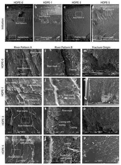 A closer look at the river patterns (Figure 4e–h) shows how these river lines are out of the plane due to the torsional nature of the test, which makes the secondary cracks and the main crack interact in different angle planes. Moreover, shear banding is revealed for the HDPE-1 nanocomposite. These shear bands have been reported to be a plastic deformation mechanism which involves large amount of energy absorption in polymers when subjected to compressive stresses []. Crazing is observed in all specimens (Figure 4i–l), and this increases in density with the nanoclay content. For the nanocomposites tearing is also evident, which also increases with nanoclay content. Figure 4m–p shows in detail the fracture origin region from which the river marks grow. Interestingly, this region seems more brittle for the HDPE-1 and HDPE-5 nanocomposites, which might be explained by the fact that at the onset of fracture, the higher modulus of these nanocomposites promoted a more brittle behavior at the highly tensile region.