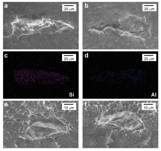 Faber and Evans also concluded that the aspect ratio of the particles has a significant effect on the toughening mechanism of particulate composites [], which might explain the performance of the HDPE-3 nanocomposite in which large agglomerates were observed. In addition, the shielding effect mentioned above is dependent on the bonding strength between the particle (or agglomerate) and the matrix through its interface []. If the bonding is poor, debonding might occur. In Figure 6, debonding of an agglomerate in HDPE-3 is observed. On one side the agglomerate is shown (Figure 6a), and in the opposite side (Figure 6b) the cavity left by the agglomerate is evident. Energy-dispersive X-ray spectroscopy (EDS) confirmed that it was a nanoclay agglomerate as Si and Al were detected (Figure 6c,d). Debonding occurs due to a mismatch in the elastic and fracture properties between the HDPE chains and the nanoclay agglomerate [], breaking the bonds that keep them temporally together (denoting a weak interfacial strength between them).