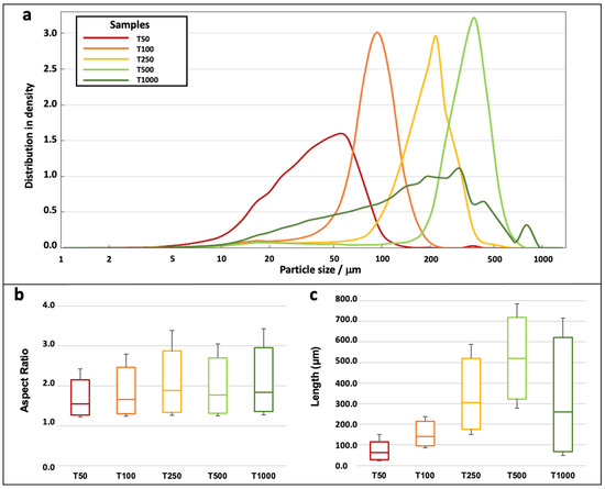 In addition, the difference in the length/diameter aspect ratios becomes clear and was confirmed by morphological analysis (Figure 2b), with a progressive increase in L/D corresponding to the size of the particles; one can notice that the T1000 sample covers the widest range of aspect ratios. The relative volumetric distribution of the particle sizes is shown in Figure 2a. Apart from the T1000 sample, which can be considered a mix of the other batches with the possible presence of leaf or pedunculi, which have a different grinding behavior, the samples show a uniform bell-shaped progression of probabilities, indicating a normal distribution of the samples. The T1000 sample has several local minima and maxima and spans a much wider range of particle sizes than the rest of the samples. The average fiber lengths (Figure 2b) are 83 μm, 166 μm, 314 μm, 507 μm, and 250 μm for the T50, T100, T250, T500, and T1000 batches; they are in line with the targeted values. Thus, these different fractions cover a large range of morphologies, which are different in terms of homogeneity and aspect ratio; the impact of these parameters on the composites’ performance will be assessed in the next section.