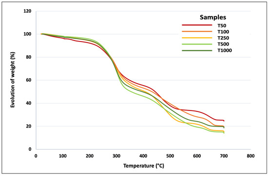 The thermal properties of the different tomato particles were investigated in order to anticipate their behavior during a process cycle, which can induce high temperatures when a thermoplastic matrix is used. Table 1 summarizes the main thermal properties of the five fractions of tomato particles and Figure 3 shows the corresponding weight–temperature curves.