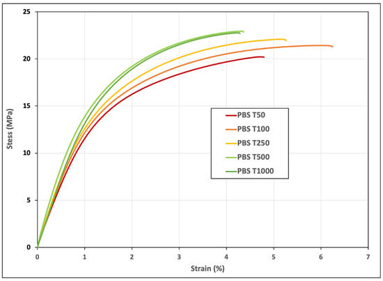 The mechanical behavior and properties of the different PBS–tomato particle composite materials are shown in Figure 4 and Figure 5, respectively. For both tensile strength and Young’s modulus, a progressive increasing trend can be seen with a greater fiber length up to T500. The composite with T1000 as a reinforcement shows a significant decrease in Young’s modulus but a stability of strength at break.