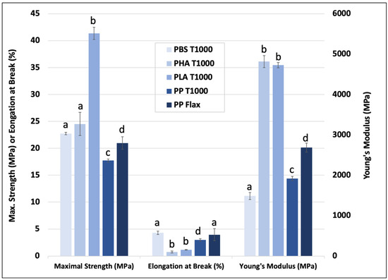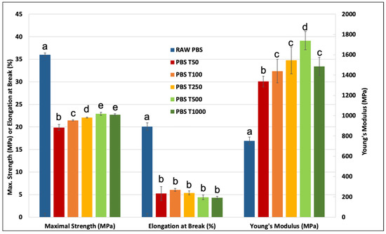 Tensile mechanical properties of PBS–tomato biomass composite materials. Letters indicate the statistical differences between the mechanical values. When letters are different, the property is significantly different.