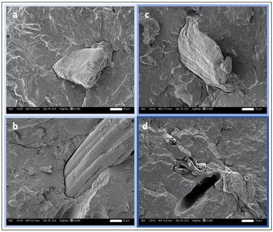 The images shown in Figure 8 provide a good impression of the quality of the interfaces for each of the four polymers used with tomato fibers. The PBS matrix seems to show the best interfaces with a very reduced gap between the matrix and the fiber. Then, the quality of the bonding between PLA and PHA on the one hand and the tomato fiber on the other hand seems to be roughly equivalent, also showing good interface quality. Finally, the situation is different with respect to PP. Specifically, matrix loosening, such as that shown in the figure, is observed; this demonstrates the weak bond between the flax fibers and the PP matrix.