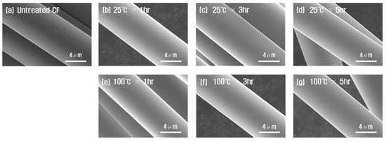 SEM photographs of carbon fibers according to chemical treatment conditions: (a) untreated CF, (b) 1 h, (c) 3 h, (d) 5 h at 25 °C and (e) 1 h, (f) 3 h, (g) 5 h at 100 °C.