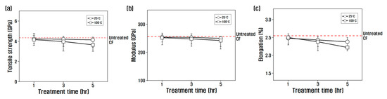 Effect of chemical treatment according to temperature and treatment time on the tensile properties of carbon fiber (a) tensile strength and (b) modulus (c) elongation.