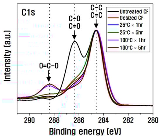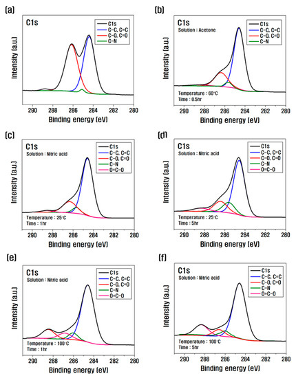 For the O/C ratio, which is an indicator of interfacial shear strength, as the temperature and time increased from 25 °C to 100 °C, from 1 to 5 h, it increased to 0.33 compared to untreated CF at 100 °C and 5 h [17]. Observation of the C1s spectra revealed that after desizing, the amount of C–O (hydroxyl groups) and C=O (carbonyl groups) present in large amounts on the surface of the CF was significantly reduced. Furthermore, the amount of C–O and C=O when the surface was treated in nitric acid at 25 °C until 1 h decreased slightly compared to the desized CF, and as it increased from 1 to 5 h, the amount of C–O and C=O increased slightly compared to 1 h, and O=C–O (lactone group) was newly created (Figure 3). In addition, as the time increased from 1 to 5 h, the bond between the carbon fiber surface and nitrogen present in nitric acid rapidly expanded, resulting in significant increases in the amount of C–N compared to the desized CF. The amount of silicon present inside the CF also increased due to the exposed surface. However, as the surface treatment in nitric acid increased from 1 to 5 h at 100 °C, the amount of C–O and C=O decreased slightly compared to the desized CF. Moreover, O=C–O was formed and expanded rapidly, and the amount of C–N increased up to 1 h at 100 °C. The amount of C–N expanded due to the reaction between carbon present on the CF surface and nitrogen of nitric acid, but after 1 h, the amount of C–N decreased slightly compared to 1 h due to the combination and removal of oxygen present on the CF and nitrogen of nitric acid. In addition, the silicon present inside the CF was removed through a violent reaction on the surface of the CF as the time increased from 1 h to 5 h, and the amount of silicon decreased compared to the desized CF. This is because the carbon present on the surface of the CF exposed by desizing during surface treatment in nitric acid at 25 °C combines with the oxygen of nitric acid and is removed as CO2, so the carbon inside the CF is slightly reduced, and the silicon inside the CF is revealed, revealing the amount of silicon. It is thought that C–O, C=O, and C–N increased and O=C–O was produced because the oxygen and nitrogen in nitric acid were bound to the CF surface. On the other hand, when the surface was treated with nitric acid at 100 °C, a strong bond was created between the carbon present on the surface of CF and the oxygen present in the nitric acid, and oxygen was introduced into the C–O and C=O bonds, resulting in the formation and rapid increase of O=C–O bonds. It is believed that silicon was rapidly reduced by the removal of carbon fiber due to the strong energy on the surface of the CF.