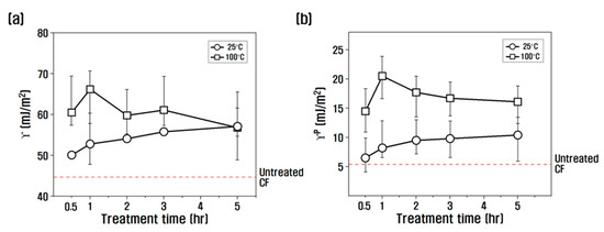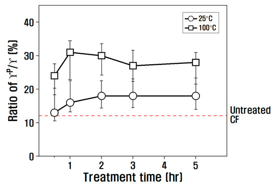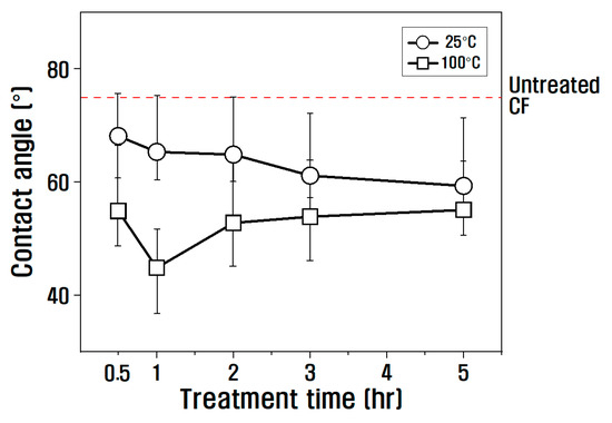 where is the total surface energy of the wetting liquid, is the nonpolar surface energy of the wetting liquid, is the polar surface energy of the wetting liquid, is the total surface energy of the specimen, is the nonpolar surface energy of the specimen, is the polar surface energy of the specimen, and is the contact angle. The polar surface energy of the specimen (i.e., the slope) and the nonpolar surface energy (i.e., the Y-intercept) were obtained from the two coordinates calculated by substituting the advance angle, which is the angle when the specimen enters the hydrophilic or hydrophobic wetting liquid, into Equation (1). The change in the dynamic contact angle of the CF according to the temperature and treatment time with nitric acid is shown in Figure 5. At 25 °C in nitric acid, the contact angle decreased compared to untreated CF as the treatment time increased from 30 min to 5 h. At 100 °C in nitric acid, the contact angle decreased compared to untreated CF from 30 min to 1 h, but after 1 h, the contact angle gradually increased compared to 1 h.