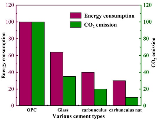 The research shows that the carbon dioxide emission of geopolymer concrete manufacturing is far lower than that of ordinary Portland cement concrete because the raw materials of geopolymer concrete do not need high-temperature calcination [15,16]. In addition, the energy consumption for the production of geopolymer concrete is greatly decreased. For example, compared with ordinary Portland cement concrete with the same strength, the energy consumption of fly ash-based geopolymer concrete is reduced by 70% [17]. The comparison of energy consumption and CO2 emissions of ordinary Portland cement and geopolymer is shown in Figure 1 [18]. Figure 1 shows that the CO2 emissions and energy consumption of geopolymers are much lower than ordinary Portland cement.