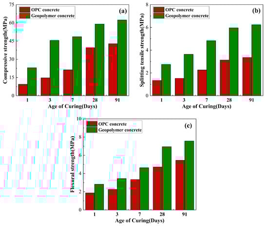 It can be seen from Table 1 that although the chemical composition of geopolymer is similar to that of ordinary Portland cement, the proportion of each chemical component is quite different. Additionally, different silica-aluminate material compositions have a great influence on the mechanical properties of geopolymer concrete [50]. The existing research results show that the performance of geopolymer concrete is superior to that of ordinary Portland cement concrete, and the performance difference is shown in Figure 5 [51].