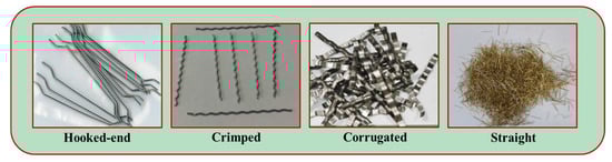 Steel fiber is mainly made of cold-drawn steel wire, steel plate, or other forms of steel, and its cross-sectional shape is mainly round, square, and rectangular [53,54]. Steel fiber is widely added to geopolymer concrete due to its high density, high tensile strength, and low cost [55]. In order to suppress the pulling of steel fibers from the concrete matrix, a large number of steel fibers with various shapes and geometries are manufactured worldwide [56]. The geometry of steel fibers that have been applied in geopolymer concrete includes hooked-end steel fiber, crimped steel fiber, straight steel fiber, twisted steel fiber, corrugated steel fiber, and others [57,58]; the more common types of steel fibers are shown in Figure 6.