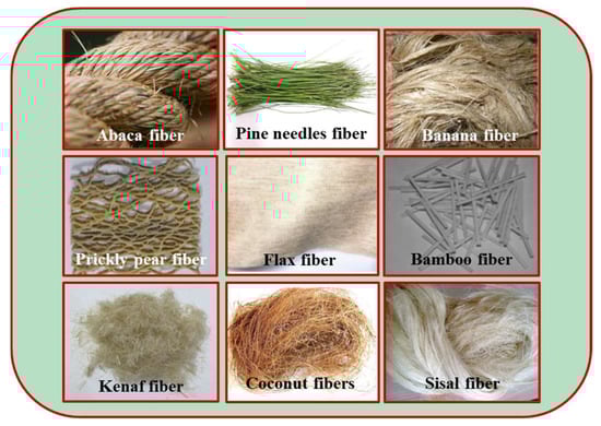 Natural fibers mainly come from three main sources: plant, animal, and mineral [90]. Plant fiber is a type of fiber obtained from different parts of the plant body, which is mainly composed of cellulose, hemicellulose, and lignin; animal fiber is a type of fiber obtained from animal hair, feathers, or insect secretions, which is mainly composed of proteins; mineral fiber is a type of fiber obtained from mineral rocks with fibrous structures, which is mainly composed of various oxides, such as silica and alumina. Compared to plant fibers, animal fibers are less used because animal fibers collected from animals are more difficult to be realized on a large scale. In addition, most mineral fibers have to be processed several times before application, and the only mineral fiber obtained without processing is asbestos, which is classified as a carcinogenic material and is not suitable for the preparation of environmentally friendly materials. In contrast, plant fiber, as an excellent natural polymer material, has the advantages of abundant reserves, repeated processing, and biodegradability [91]. Moreover, plant fiber has the mechanical characteristics of high strength and low hardness. Based on these advantages, adding plant fibers to concrete can improve brittleness and increase the toughness of the material [92]. Therefore, plant fibers have a wide application prospect in fiber-reinforced geopolymer concrete, and the typical plant fibers are shown in Figure 9.