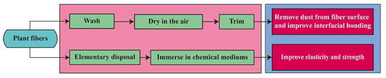 Plant fiber is a biological resource, which is mainly composed of cellulose, pectin, and lignin [93]. Different compositions lead to different properties of fibers. When plant fibers are used as reinforcement material, the adhesion between the fibers and the matrix is affected by the hydrophobic or hydrophilic properties of the fibers, because plant fibers usually swell after contact with water. The property of plant fiber is an important factor in the performance of fiber-reinforced geopolymer concrete. To ensure the performance of fiber-reinforced geopolymer concrete, the surface of the plant fiber is usually pretreated. The general process of surface treatment of plant fibers is shown in Figure 10 [94].