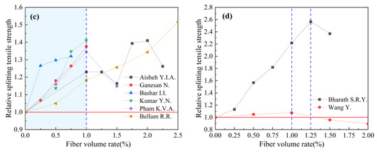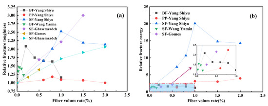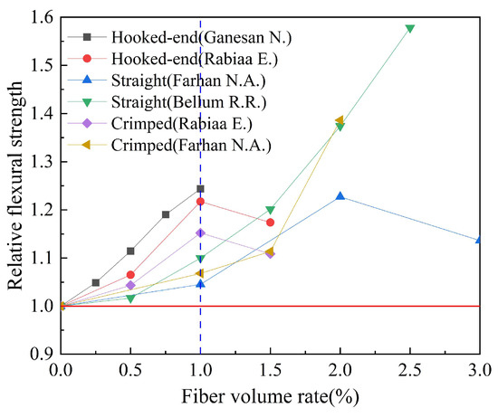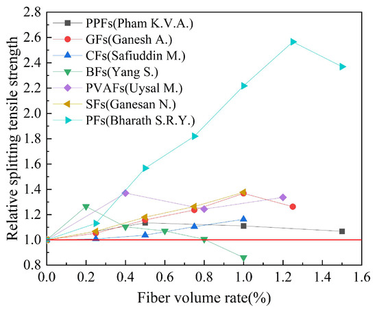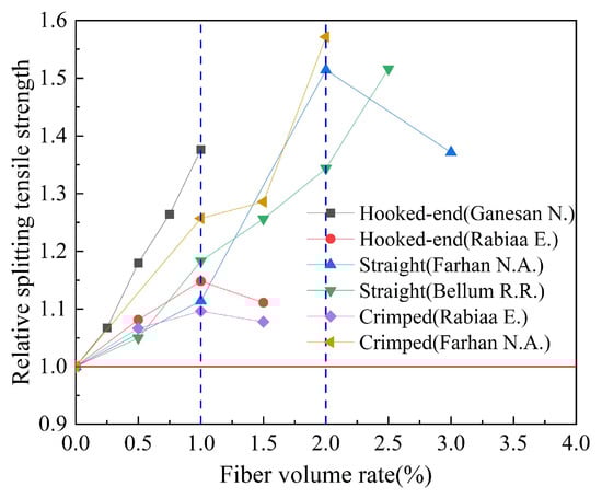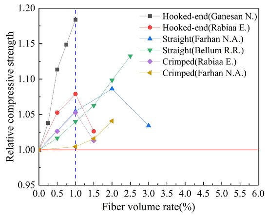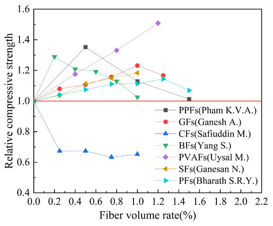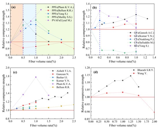 By combing the experimental data of the mechanical properties of fiber-reinforced geopolymer concrete in the published literature, the effects of fiber types on the compressive strength, splitting tensile strength, and flexural strength of geopolymer concrete are counted in Table 6. The fiber types counted in Table 6 mainly include steel fibers, glass fibers, basalt fibers, carbon fibers, polypropylene fibers, polyvinyl alcohol fibers, and plant fibers. The influence of the steel fiber shape on the compressive strength, splitting tensile strength, and flexural strength of geopolymer concrete is analyzed in Table 7. The steel fiber types in Table 7 are mainly straight, hooked, and crimped. The effects of fiber volume rate on compressive strength, splitting tensile strength, and flexural strength of geopolymer concrete are shown in Table 8. The fibers in Table 8 are mainly divided into synthetic fiber, inorganic fiber, steel fiber, and plant fiber. The influence of the fiber aspect ratio on the compressive strength, splitting tensile strength, and flexural strength of geopolymer concrete is counted in Table 9. The fiber aspect ratio in Table 9 is mainly 60, 70, 200, and 300. In Table 10, the effects of hybrid fibers on the compressive strength, splitting tensile strength, and h and flexural strength of geopolymer concrete are counted. The hybrid types are mainly replaced type and addition type.