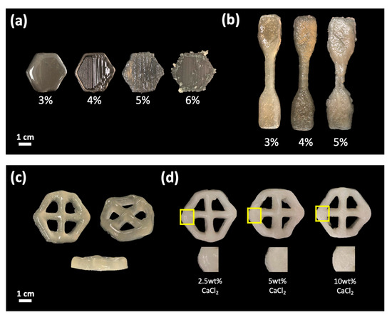 The comparison of 3D printing after partial dissolution at different concentrations of CNF: (a) One-layer structure design, (b) ASTM type IV, (c) Hexagonal shape with an infill of 10%, and (d) Different concentration CaCl2 as the additional crosslinker.