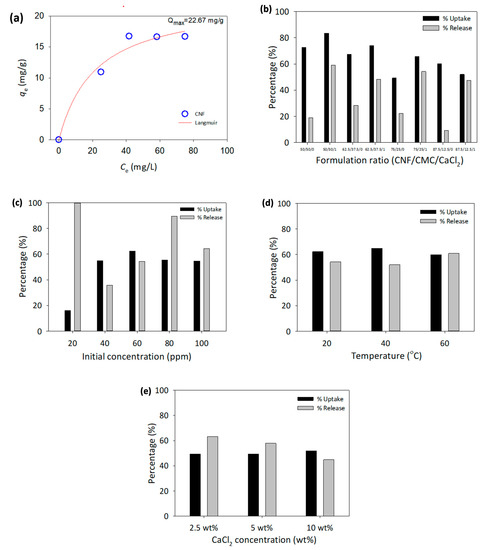 (a) Adsorption of BSA by neat cellulose using Langmuir isotherm model and CNF/CMC performances on uptake and release of BSA at difference (b) Formulation ratio, (c) Initial concentration of BSA, (d) Temperature and (e) Concentration CaCl2.
