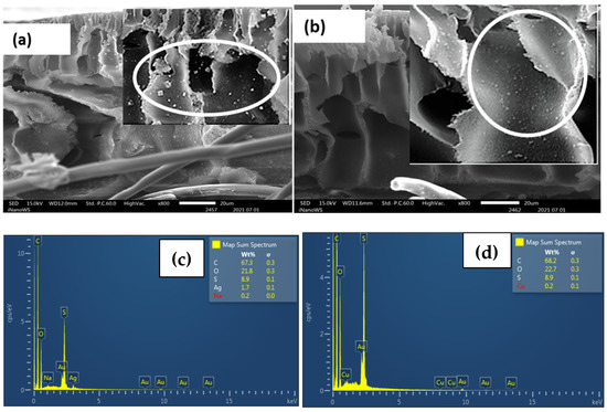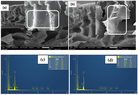 Cross-sectional images of functionalized Ag and Cu CEM-3.5 membranes: (a) CEM-Ag3; (b) CEM-Cu3. (c) EDS spectrum of CEM-Ag3; (d) EDS spectrum of CEM-Cu3.